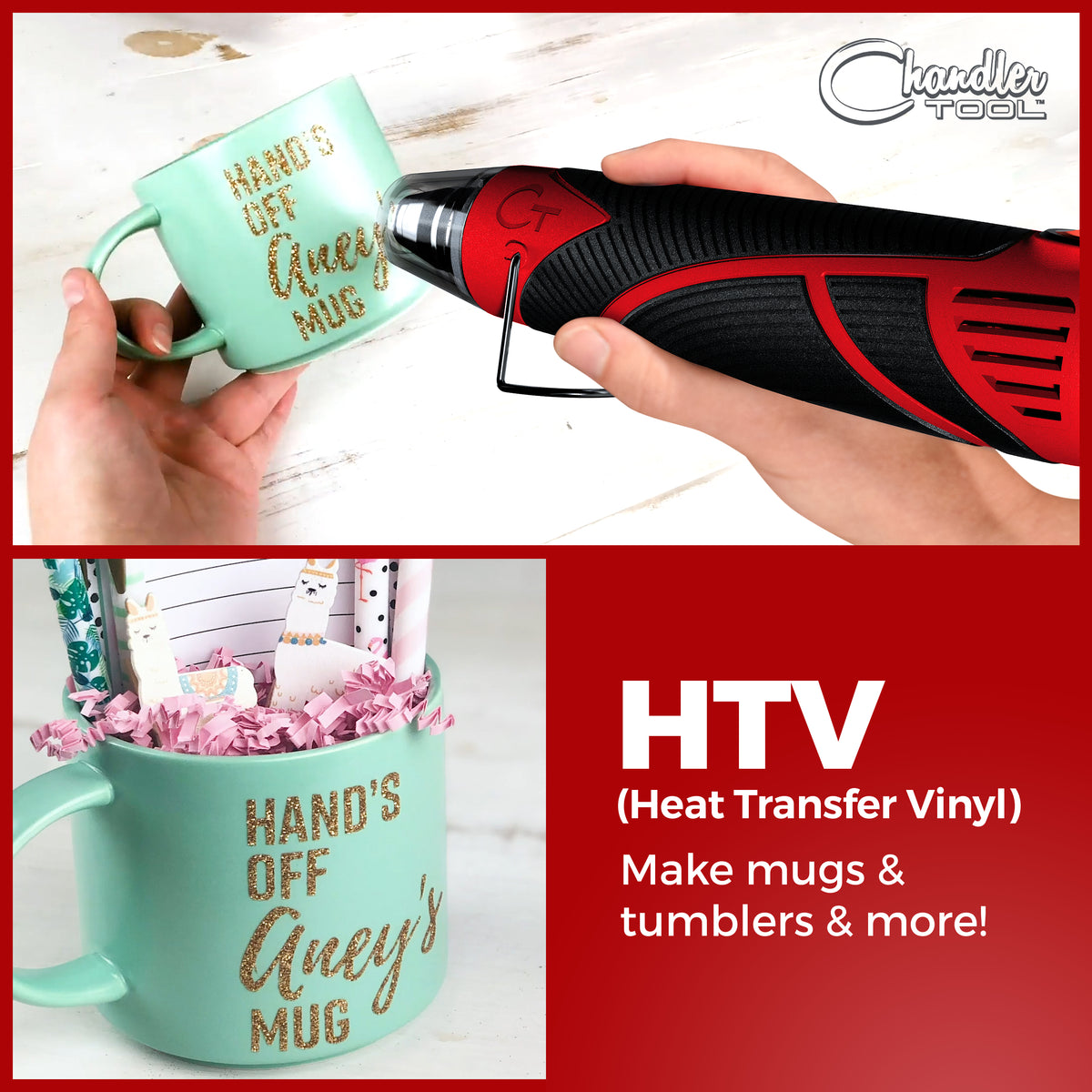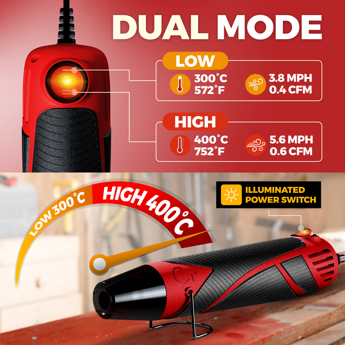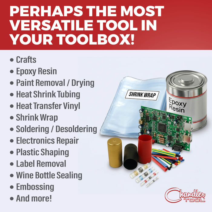 Complete with 2 variable heat settings; low and high. Heats up in minutes, ready to tackle almost any project. The low heat/airspeed setting is perfect for delicate or detailed crafts, while the high heat/airspeed setting is geared toward heavy-duty and larger surface area projects. Perfect for crafts, automotive, electronics, embossing powders, vinyl wrap, HTV, epoxy resin, shrink wrapping, shrink tubing, shrink tube connectors, decals, wine bottle shrink capsules, EVA foam, transfers, acrylic, shrink film, cell phone and tablet repair, soldering, jewelry making, wire connectors and so much more. We are exhausted just thinking about all of the possibilities.