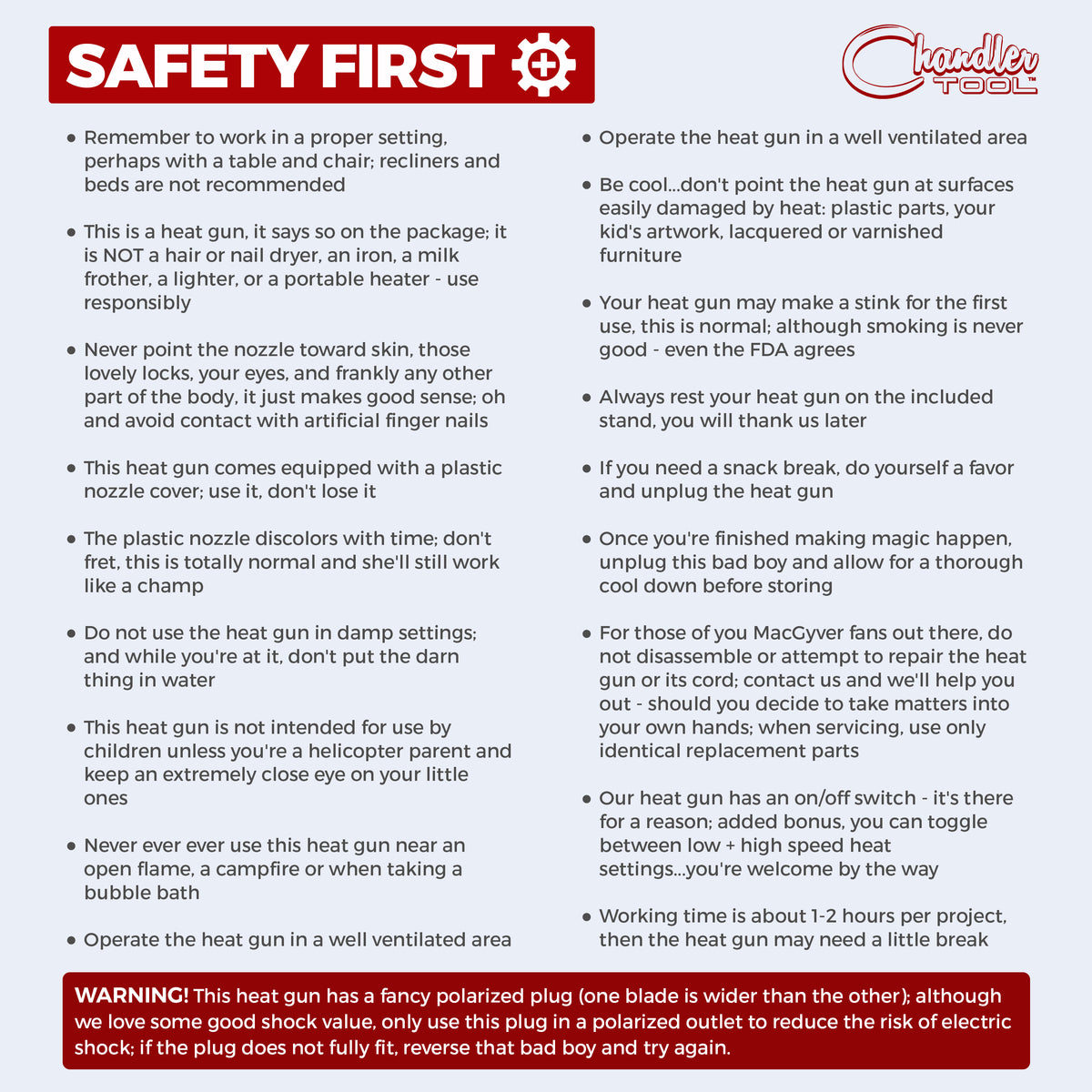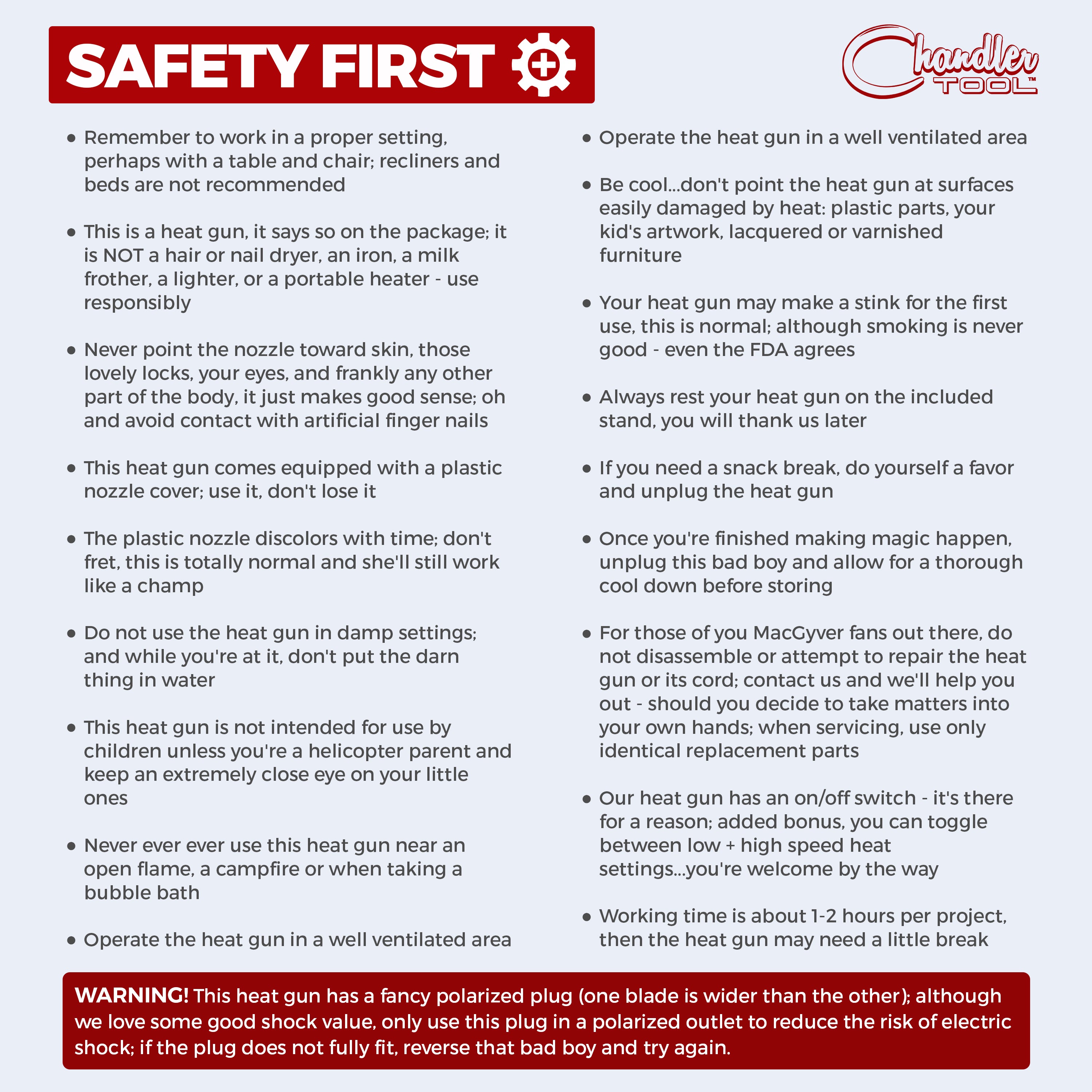 • HEAT SAFETY: They're called heat guns for a reason. They get hot. Our heat gun comes with an insulated plastic nozzle that covers the metal tip protecting those precious digits of yours. Do us a favor, don't take the nozzle off. Although getting really high is fun, high heat that is - we always recommend keeping that bad boy on.