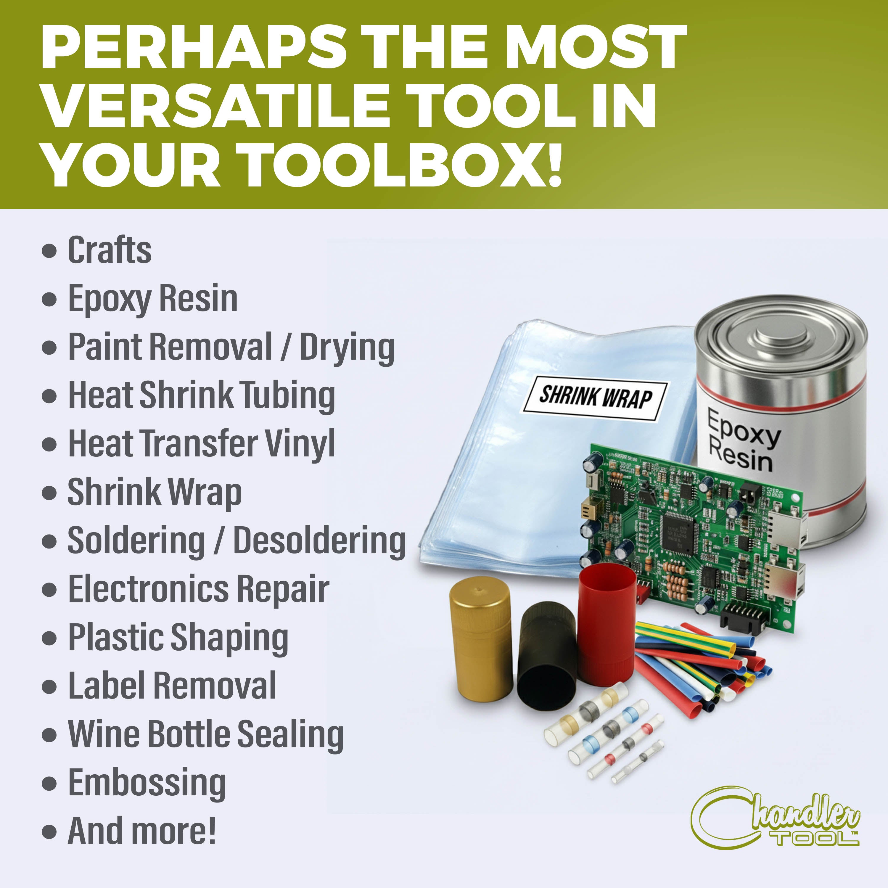 Complete with 2 variable heat settings; low and high. Heats up in minutes, ready to tackle almost any project. The low heat/airspeed setting is perfect for delicate or detailed crafts, while the high heat/airspeed setting is geared toward heavy-duty and larger surface area projects. Perfect for crafts, automotive, electronics, embossing powders, vinyl wrap, HTV, epoxy resin, shrink wrapping, shrink tubing, shrink tube connectors, decals, wine bottle shrink capsules, EVA foam, transfers, acrylic, shrink film, cell phone and tablet repair, soldering, jewelry making, wire connectors and so much more. We are exhausted just thinking about all of the possibilities.
